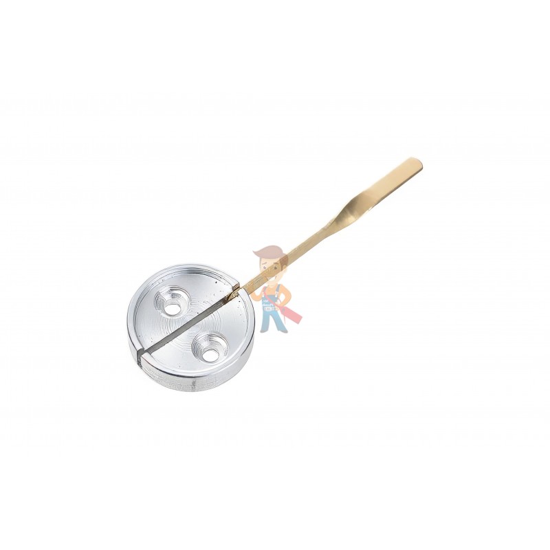 В сборе устройство для опечатывания с флажком, похоже на круг с рукоятью и пломбой.